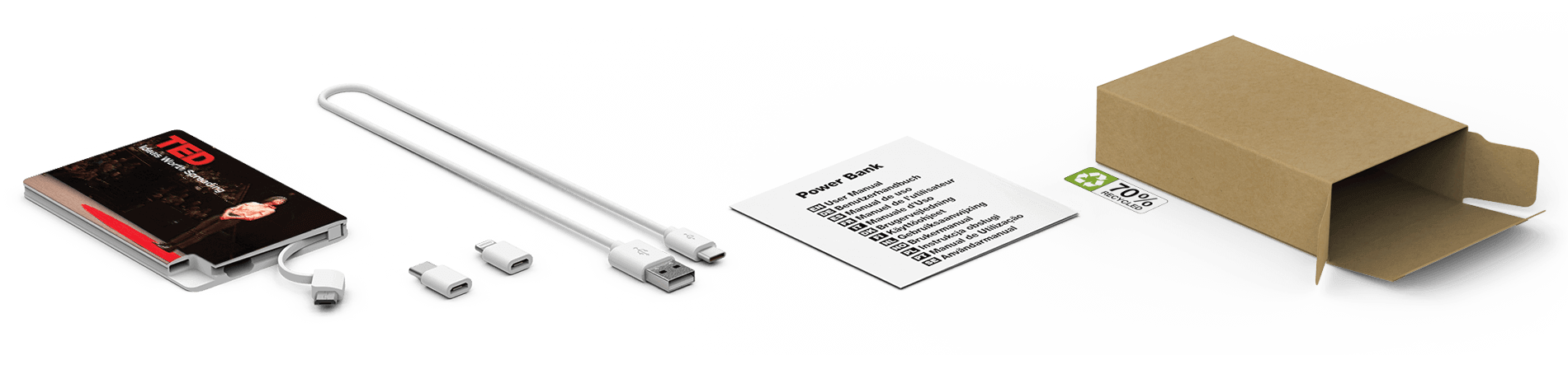 A Kártya egy kis méretű power bank, amely emlékezetes erejű. Ez'a tökéletes ingyenes ajándék a kiállítási standon vagy a dolgozóknak, hogy a telefonjuk akkumulátora mindig teljesen feltöltve maradjon, és készen álljon a fontos telefonhívásokra és megbeszélésekre. A Lightning- és USB-C-adapterrel is rendelkező, kötött micro-USB-kábellel ellátott készülék minden nagyobb márkájú mobileszközzel kompatibilis, a telefonoktól a táblagépekig.