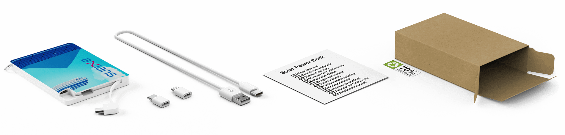 A Solar kártya egy innovatív tervezésű, fantasztikus power bank. Az egyik oldalán elképesztő reklámfelülettel rendelkezik, a másikon egy napelem található, ami árammá alakítja a nap energiáját, és feltölti vele a power banket. A Solar kártya hagyományos módon is feltölthető az USB-C bemenettel. Remek promóciós termék, amit évekig megtartanak.