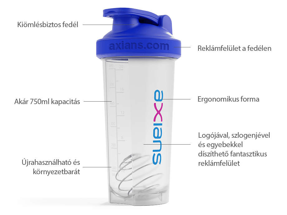 Mix shaker palackunk 4 szabványos fedélszín közül választhat, amelyekhez illesztheti vagy kontrasztosíthatja logóját a figyelemfelkeltő megjelenés érdekében.